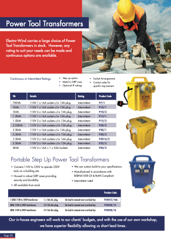 Electro-Wind carries a large choice of Power Tool Transformers in stock. However, any rating to suit your needs can be made and continuous options are available.
